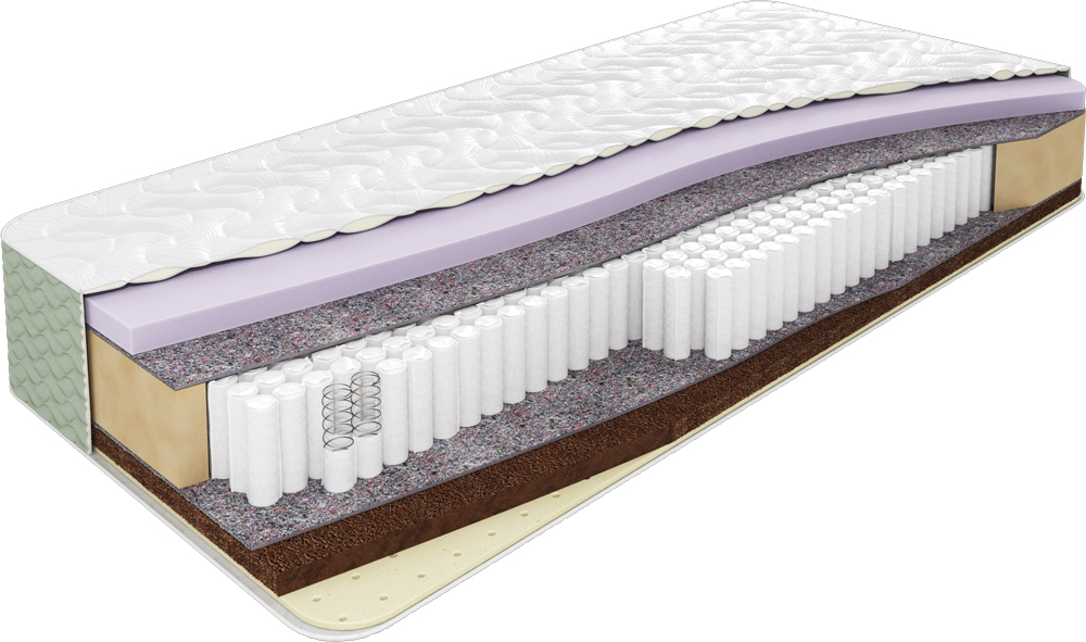 • Четырехслойное наполнение: Латекс (10 мм) – обеспечивает упругость и адаптивность под тело. Кокосовая койра (30 мм) – добавляет жесткости и улучшает циркуляцию воздуха. Пенополиуретан (40 мм) – смягчает давление на суставы. Пружинный блок S1000 с независимыми пружинами (около 500 пружин на 1 квадратный метр), даёт индивидуальную поддержку для каждого участка тела.