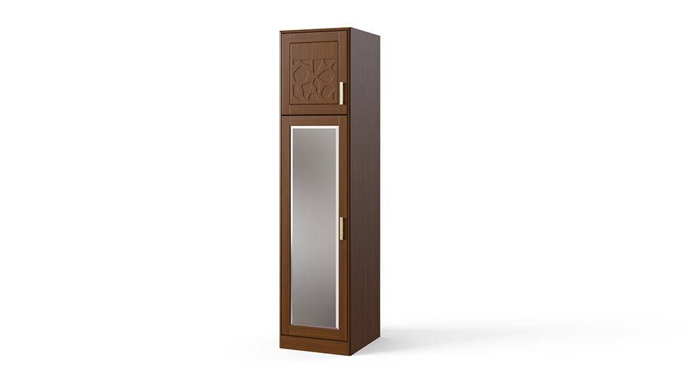 Шкаф производится с антресолью в верхней или нижней части шкаф. В стандартном исполнении в большей створке шкафа расположено зеркало с фацетом, которое выполняет роль филенки в фасаде, по желанию возможна установка дверей из 100 % массива дерева. Корпус шкафа изготавливается только из массива бука или ясеня. Одностворчатый шкаф идеально подходит для составления мебельных композиций в качестве модульного элемента. Авторская резьба на фасадах шкафа делает его произведением мебельного искусства. Распашные дверцы шкафа оснащены петлями с системой дозакрытия в базовой комплектации. Стандартно предусмотрено две комплектовки шкафа: с антресольной секцией вверху или внизу. По желанию шкаф может быть оснащен любым количеством полок. Требуется сборка.