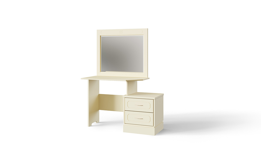 Туалетный стол выполненный в едином стиле коллекции мебели для спальни Варна - комлектуется зеркалом в багете из массива бука или ясеня. Стол обладает тумбой с двумя вместительными выкатными ящиками на телескопических направляющих. Сборка не требуется.
