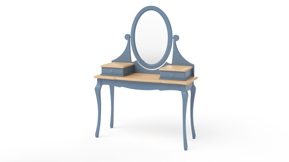 Изысканный и утонченный туалетный столик изготовлен в стиле Французского прованса. Стол будет прекрасным и функциональным дополнением для спальни вашей мечты в стиле уютной деревушки на средиземноморском побережье Франции. Туалетный стол изготовлен из массива бука. Этот уникальный материал очень долговечный и экономичный. Длинные, резные и элегантные ножки делают стол воздушным и невесомым. Овальное зеркальце придаёт ему изыска. На столешнице есть небольшие ящики для хранения украшений, которые добавляют столику функциональность. Цветовая гамма выполнена из натуральных оттенков, характерных для Прованса: голубой, слоновая кость, оливковый, венге и серый. При производстве всей мебели используется мебельная фурнитура GTV. За небольшую доплату все выдвижные ящики стола можно укомплектовать доводчиками.