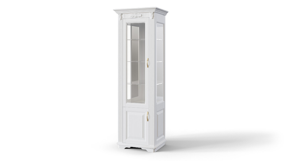 Одностворчатые, двухстворчатые и трехстворчатые витрины для гостинной «Палермо», изготовленные из массива бука или ясеня со стеклянными боковыми стенками и фасадами рамочной конструкции со стеклом, обработанным фацетом. Витрина имеет четыре стеклянные полки, задняя стенка имеет в своей конструкции два соединенных зеркала, которые делают интерьер более легким и изысканным. В базовой комплектации витрины оснащаются выкатными ящиками или опционально под заказ - распашными створками. Изысканная классика — вот стиль витрины и интерьера «Палермо». Требуется сборка.
