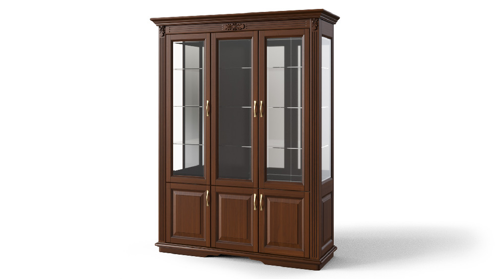Одностворчатые, двухстворчатые и трехстворчатые витрины для гостинной «Палермо», изготовленные из массива бука или ясеня со стеклянными боковыми стенками и фасадами рамочной конструкции со стеклом, обработанным фацетом. Витрина имеет четыре стеклянные полки, задняя стенка имеет в своей конструкции два соединенных зеркала, которые делают интерьер более легким и изысканным. В базовой комплектации витрины оснащаются выкатными ящиками или опционально под заказ - распашными створками. Изысканная классика — вот стиль витрины и интерьера «Палермо».