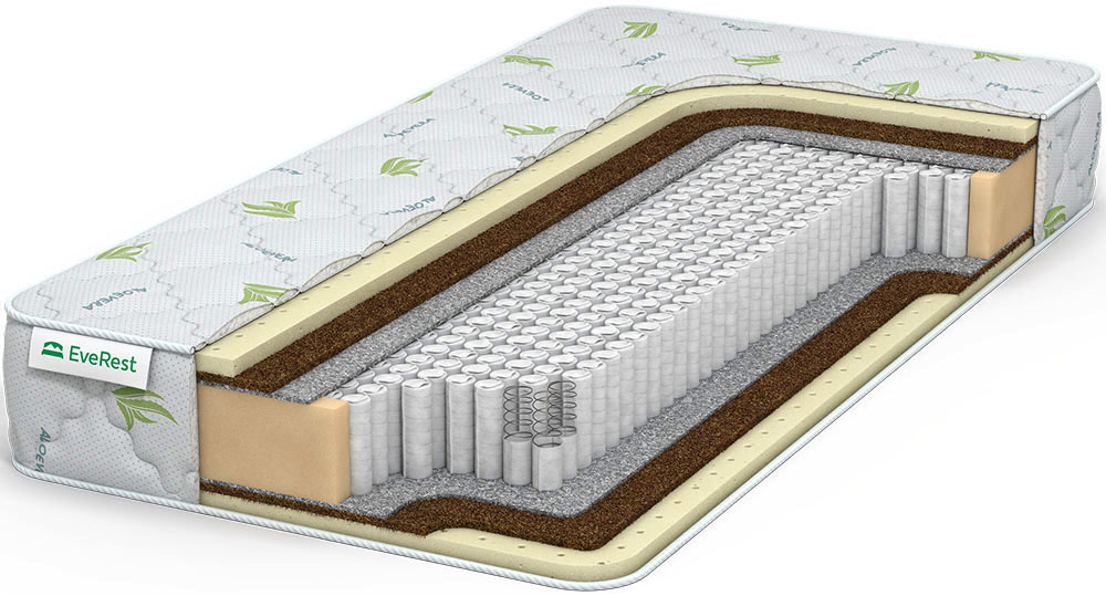 Пружинный матрас средней жесткости с натуральным латексом на спальной поверхности и слоем бикокоса с двух сторон. Относится к изделиям с ортопедическими свойствами. Основа модели — блок S1000 из адаптивных микропружин. Каждая из них упакована в индивидуальные чехлы. Жесткость матрасу придает бикокосовый настил, изготовленный из койры и холлофайбера. От истирания пружинами бикокос защищен войлоком. Мягкость спальному месту с двух сторон придает природный латекс. Перфорация материала обеспечивает свободный воздухообмен. Чехол матраса изготовлен из хлопкового прочного трикотажа с антисептической пропиткой AloeVera.