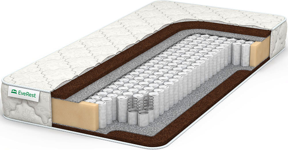 Пружинный жесткий матрас с одним видом наполнителя — койрой кокоса. Популярный блок независимых пружин TFK, придает ортопедический эффект матрасу. В его основе лежат самые прочные пружины с сечением стальной проволоки 1,8 мм. Плотность размещения пружин — 250 пр./кв.м. Жесткость матрасу с двух сторон придают кокосовые плиты 2 см толщиной. Это натуральный наполнитель, пропитанный латексом для скрепления волокон кокоса и повышения пластичности настила. Между наполнителем и пружинным блоком проложен войлок, защищающий койру от истирания. Покрытие матраса из хлопкового жаккарда.