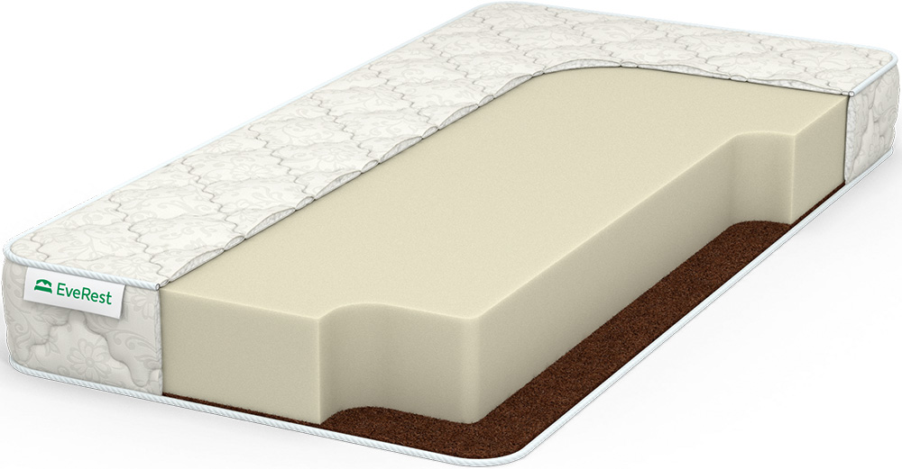 Беспружинный матрас включает наполнители двух видов: природную койру и пенополиуретан. Модель разносторонней жесткости высотой 19 см. Монолит пенополиуретана толщиной 18 см лежит в основе матраса. Он изготовлен из высокоэластичного полиэфира по технологии вспенивания. Благодаря своей структуре обладает упругостью и воздухопроницаемостью. Обеспечивает умеренную жесткость одной из спальных поверхностей. Плита койры кокоса, для повышения эластичности пропитанная латексом, придает жесткость второму спальному месту. Матрас не вызывает аллергии, поглощает вибрацию и обеспечивает комфортный сон. Чехол выполнен из смесового жаккарда.
