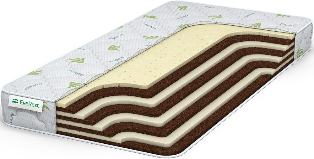 Беспружинный матрас с тремя видами наполнителя: природного латекса, койры и пенополиуретана. Верхние и нижние спальные поверхности разносторонней жесткости. Матрас подобен слоеному пирогу: в нем умеренно-мягкие пенополиуретановые настилы чередуются с жесткой кокосовой койрой. Верхний настил матраса выполнен из перфорированного латекса, обладающего упругостью и умеренной мягкостью за счет спиралеобразных молекул. Этот натуральный материал хорошо восстанавливается после деформации. Низ модели жесткий за счет кокосовой плиты. Чехол матраса изготовлен из смесового трикотажа, пропитанного составом с антисептическими свойствами AloeVera.