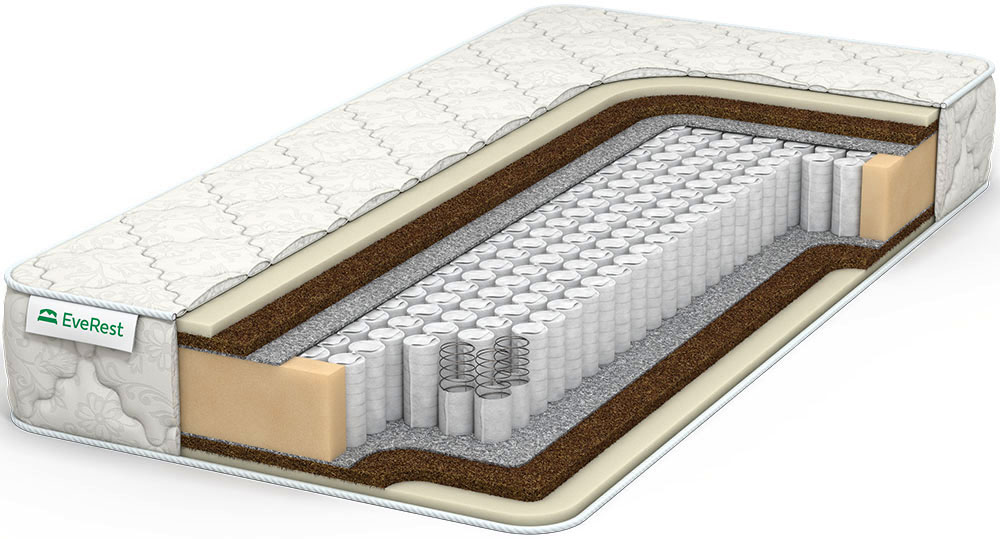 Пружинный матрас с ортопедическими свойствами с искусственным латексом на спальной поверхности и бикокосовыми плитами с двух сторон. Относится к моделям средней жесткости.